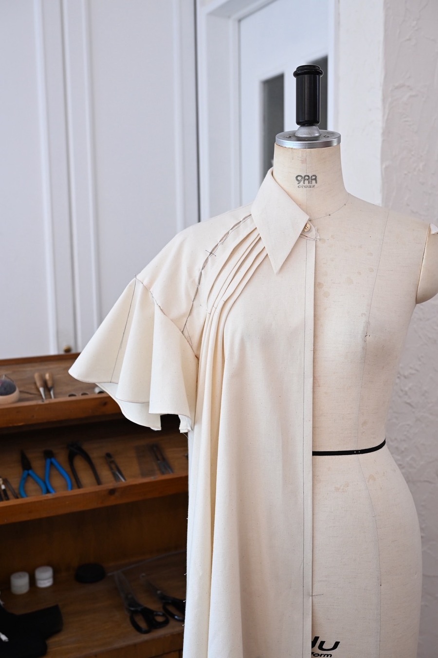 最近は立体裁断という手法でトルソーに布をあてながら型紙を作っていきます。