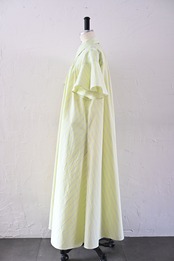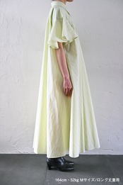 MASAHIRO OKUNOらしさを詰め込んだシャツワンピースならぬシャツドレスです。クラシカルな雰囲気もありながら、さらっと羽織れるドレスに仕立てています。袖のフリルと胸元に施したタックが最大の特徴。胸元のタック、後ネックのタックによって、裾廻りのたっぷりな分量感を作っています。衿は、70年代の雰囲気が漂う通称「デカ衿」。衿の存在感が全体の印象を引き締めています。素材はコットンとナイロンの混紡生地を使用。とても軽く、少し張り感のある風合いです。サイドにはポケット付き。