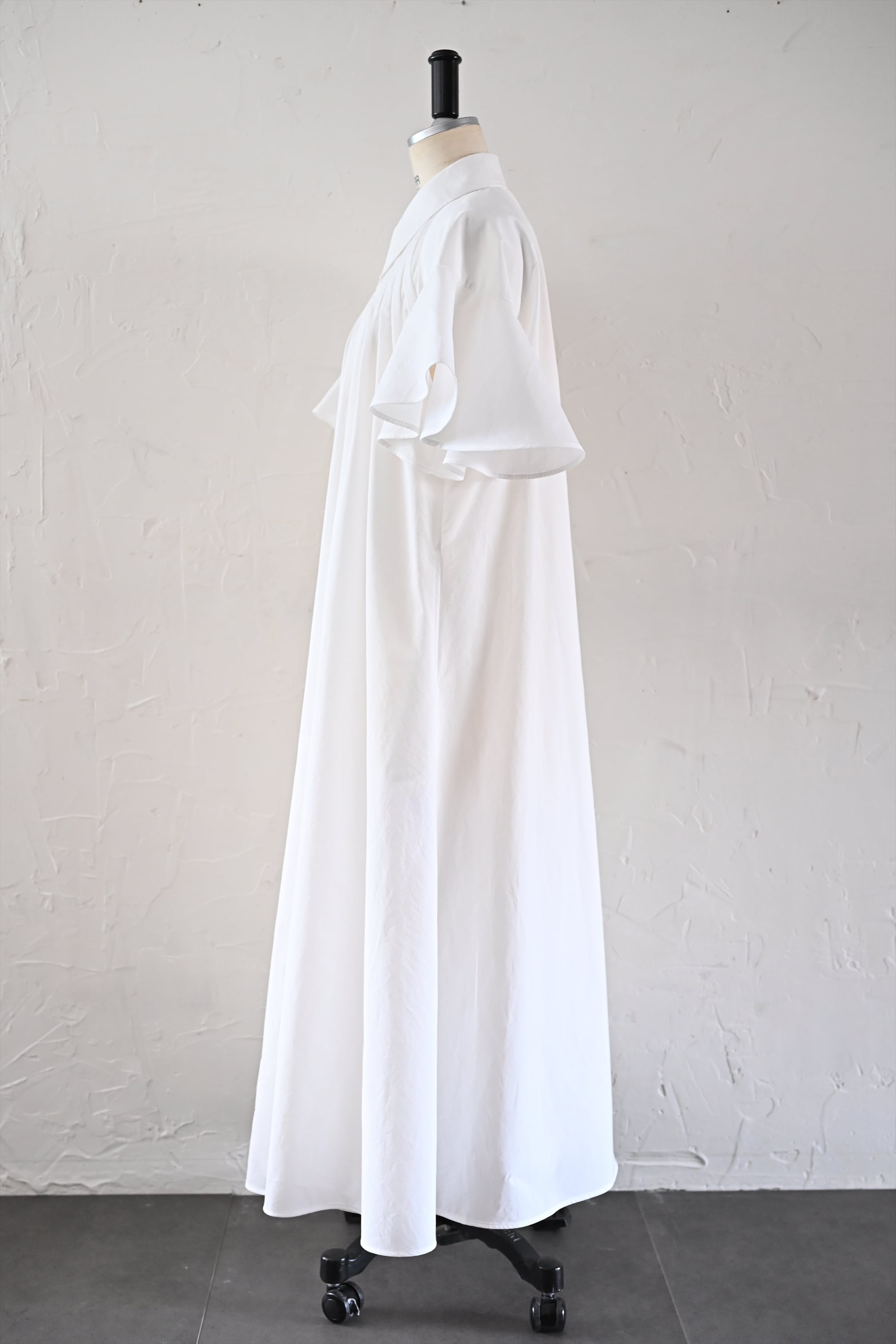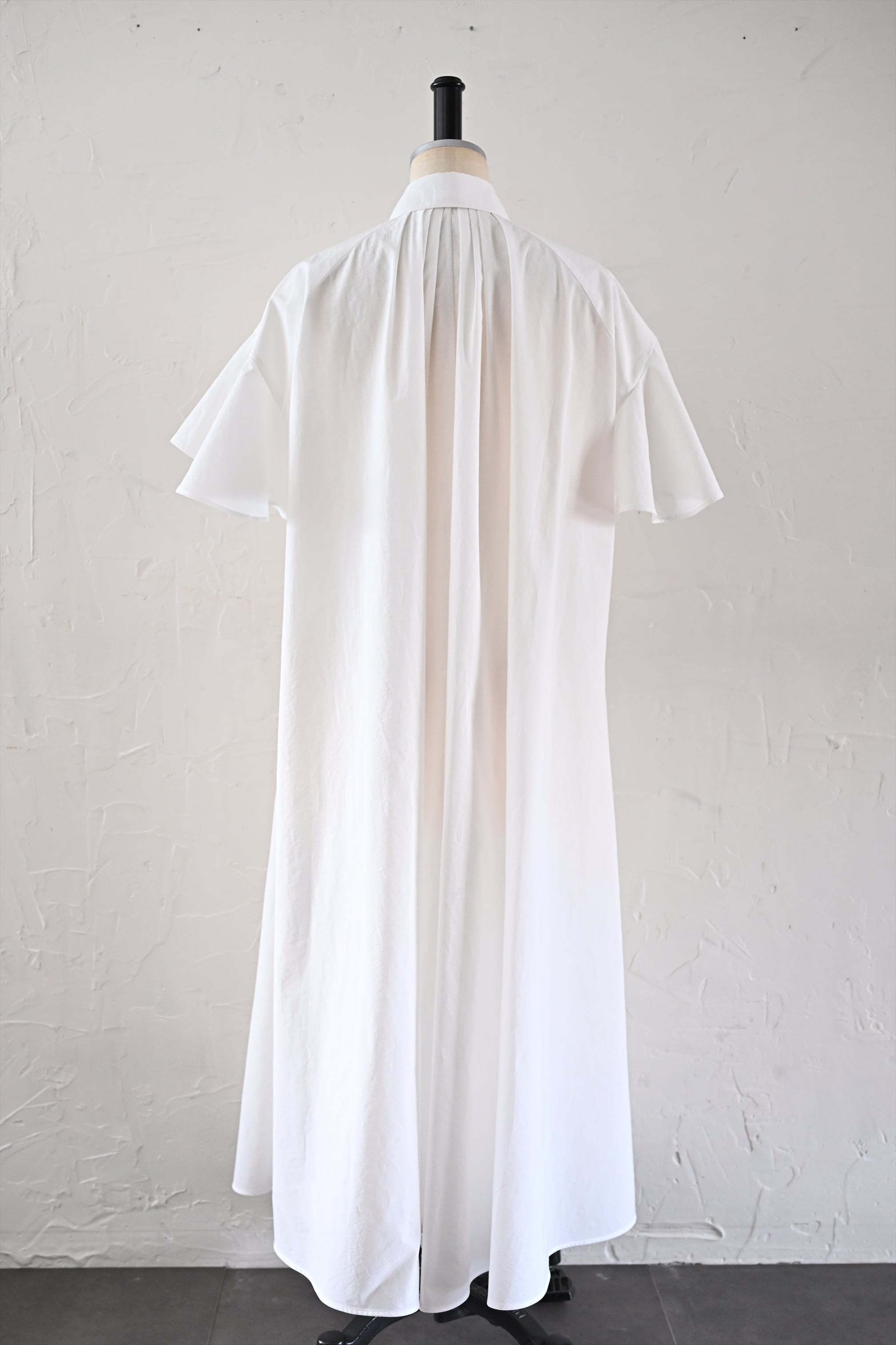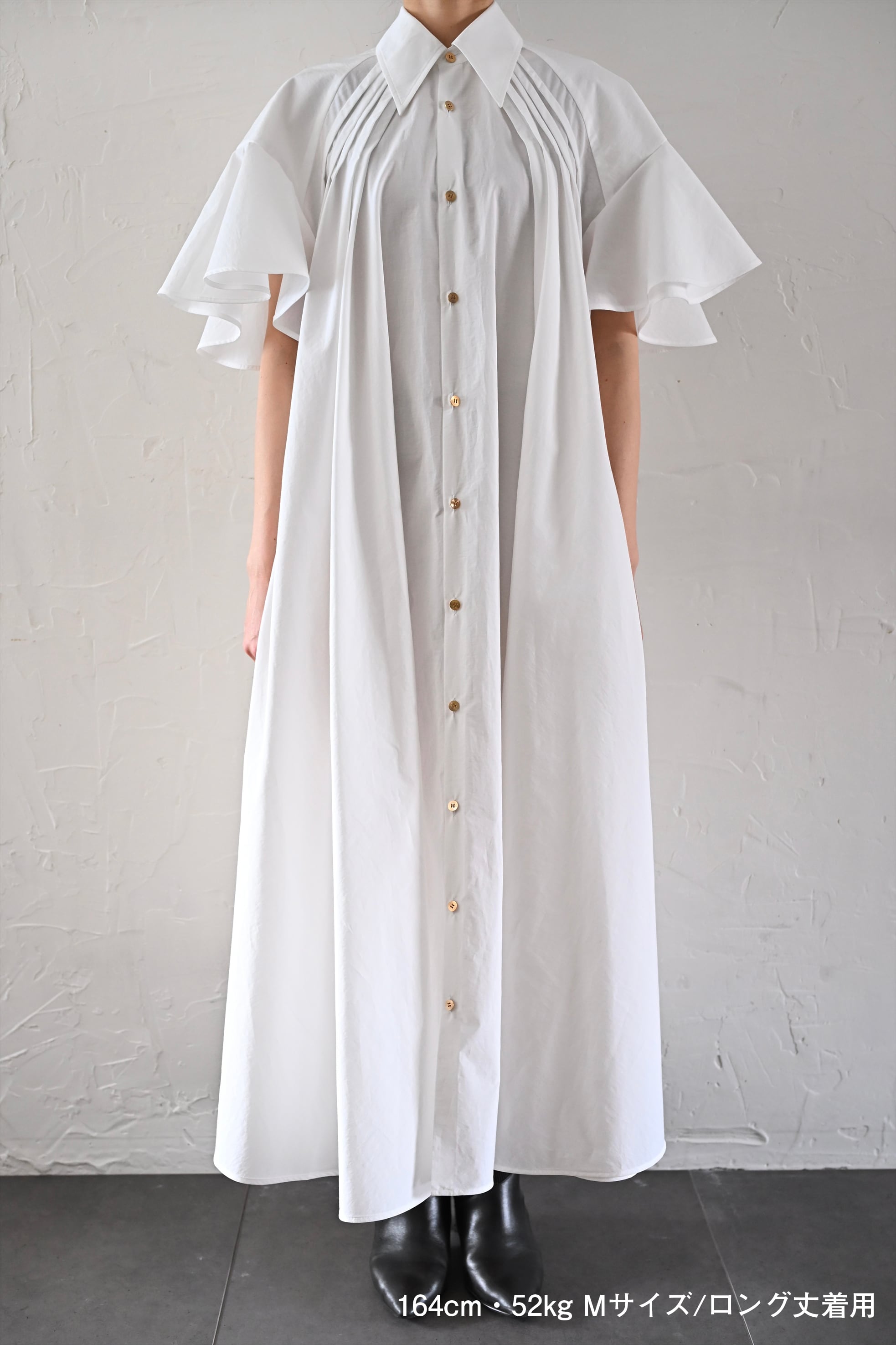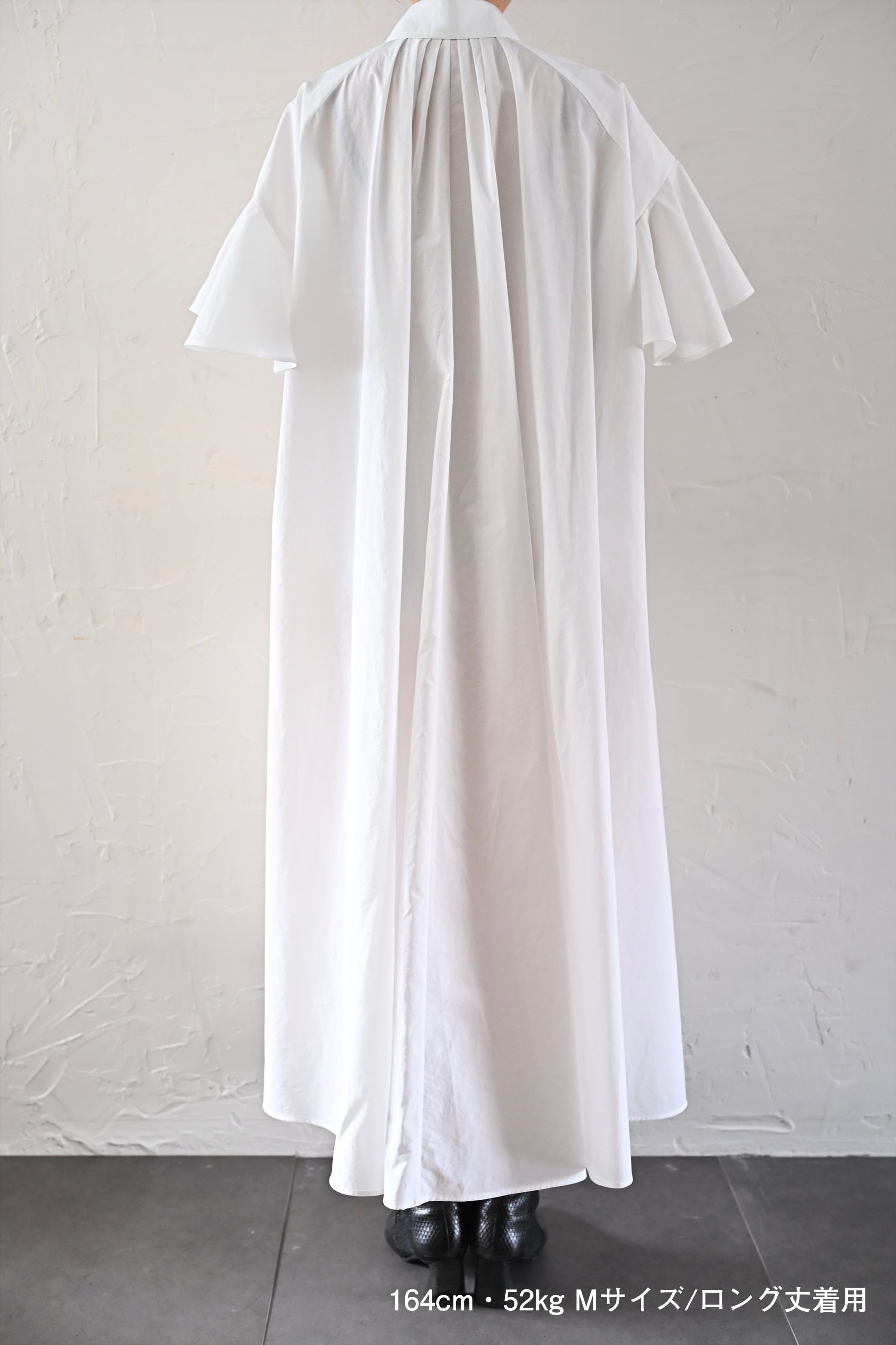 MASAHIRO OKUNOらしさを詰め込んだシャツワンピースならぬシャツドレスです。クラシカルな雰囲気もありながら、さらっと羽織れるドレスに仕立てています。袖のフリルと胸元に施したタックが最大の特徴。胸元のタック、後ネックのタックによって、裾廻りのたっぷりな分量感を作っています。衿は、70年代の雰囲気が漂う通称「デカ衿」。衿の存在感が全体の印象を引き締めています。素材はコットンとナイロンの混紡生地を使用。とても軽く、少し張り感のある風合いです。サイドにはポケット付き。