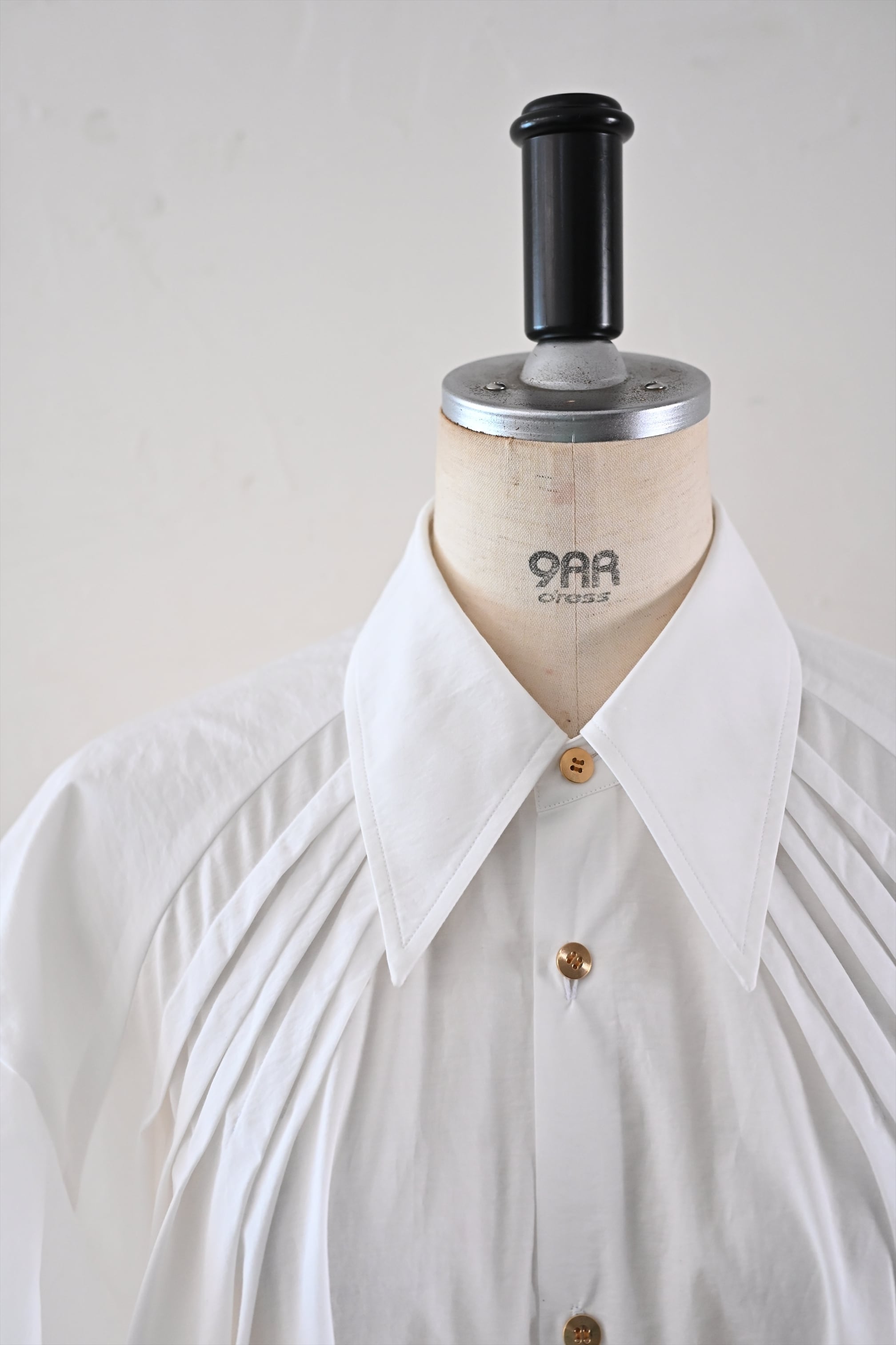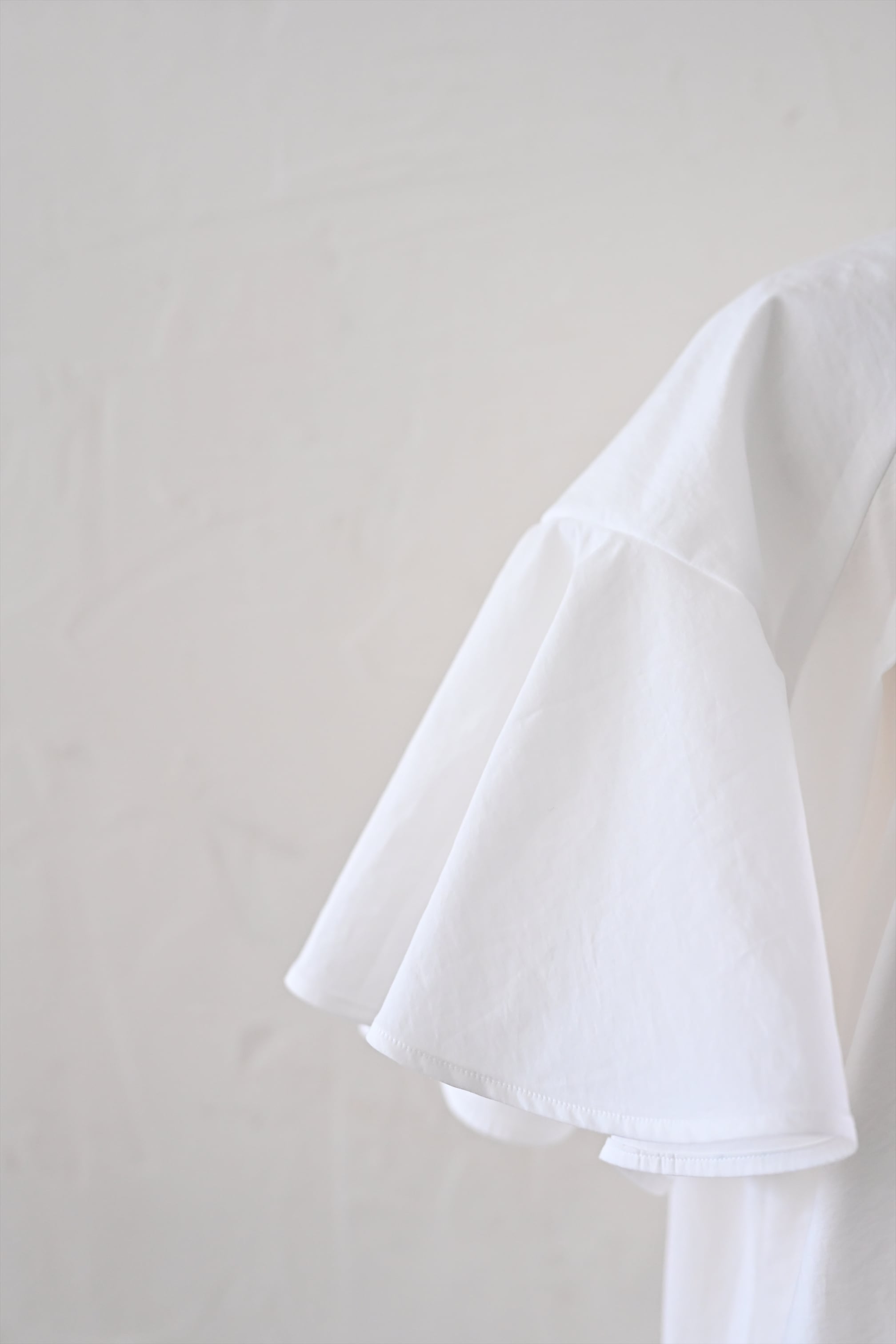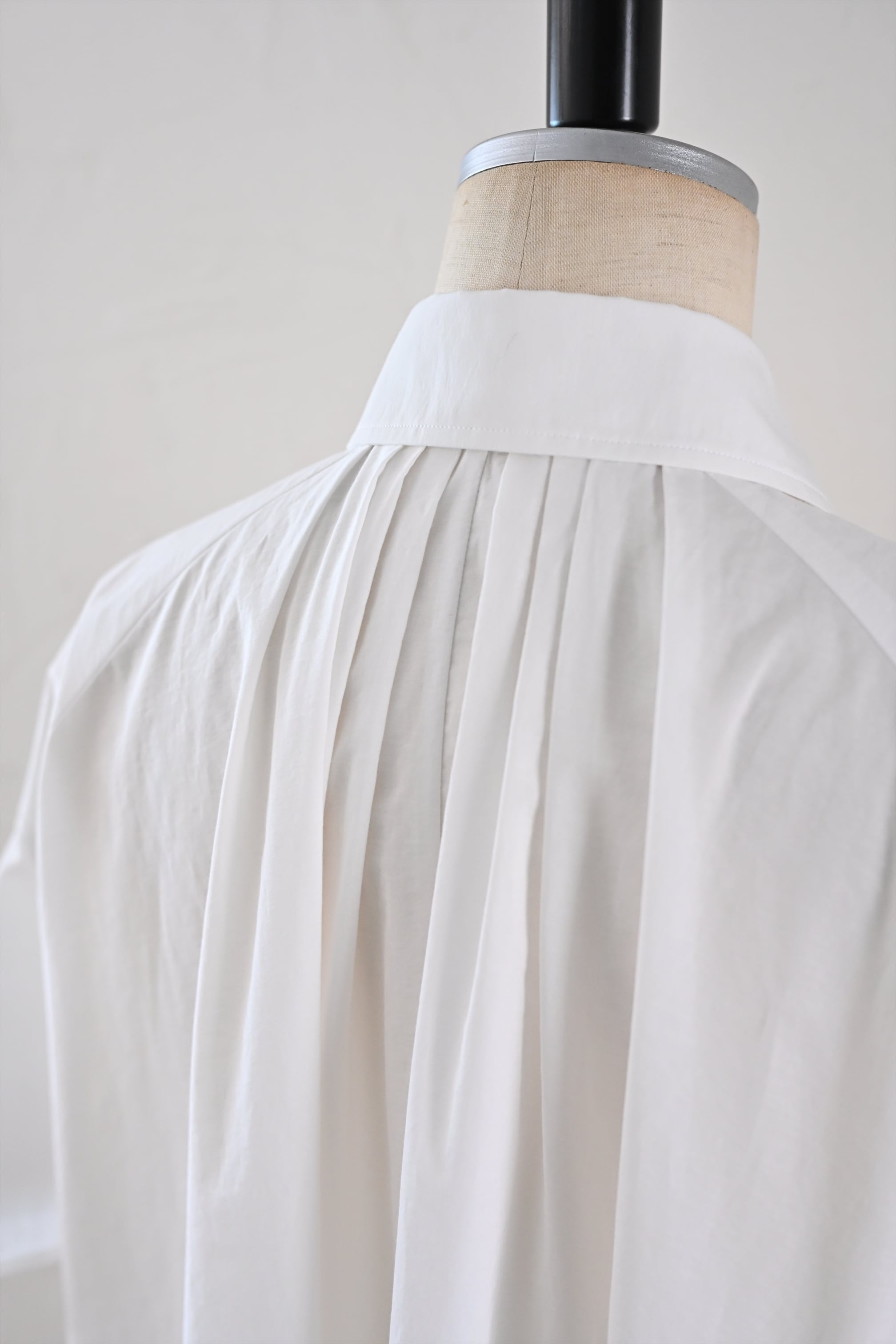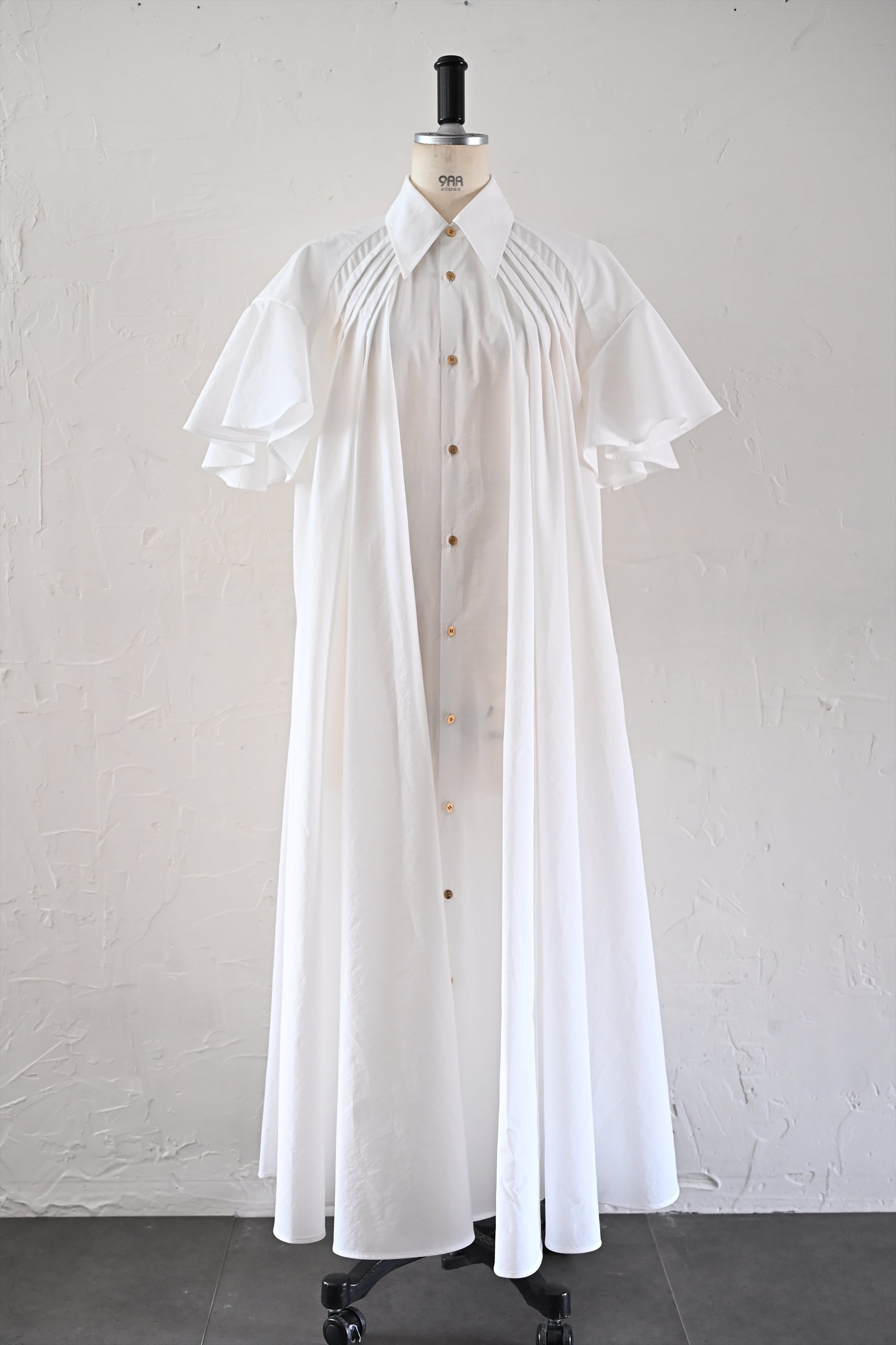 MASAHIRO OKUNOらしさを詰め込んだシャツワンピースならぬシャツドレスです。クラシカルな雰囲気もありながら、さらっと羽織れるドレスに仕立てています。袖のフリルと胸元に施したタックが最大の特徴。胸元のタック、後ネックのタックによって、裾廻りのたっぷりな分量感を作っています。衿は、70年代の雰囲気が漂う通称「デカ衿」。衿の存在感が全体の印象を引き締めています。素材はコットンとナイロンの混紡生地を使用。とても軽く、少し張り感のある風合いです。サイドにはポケット付き。