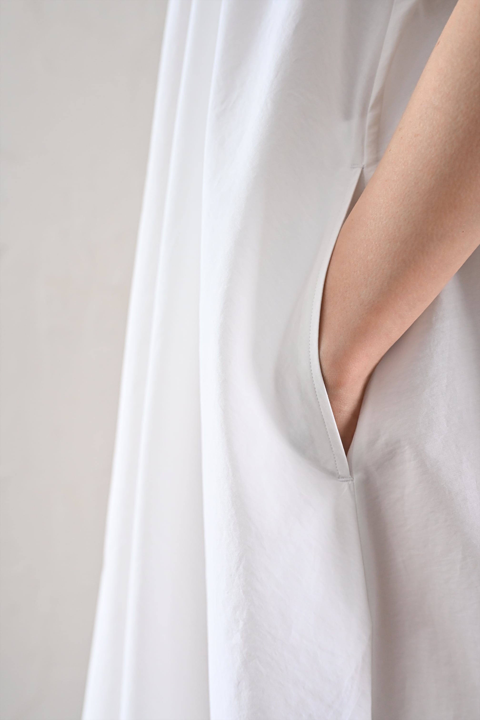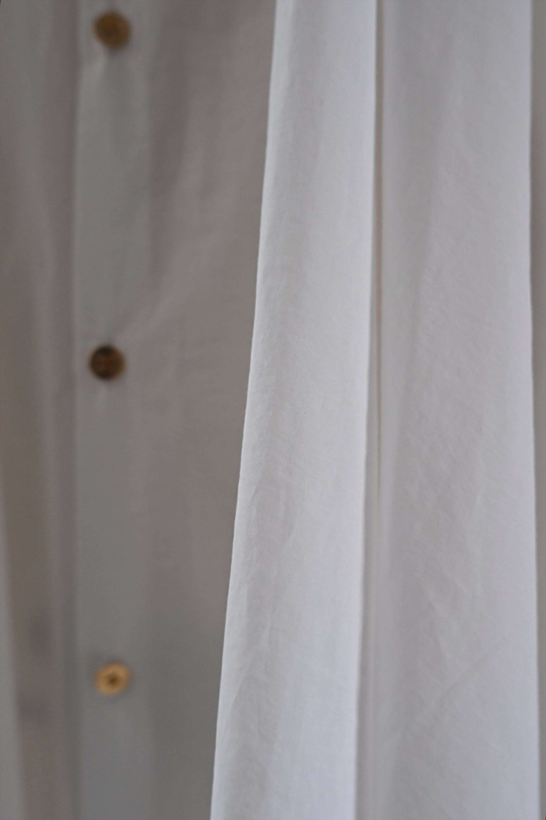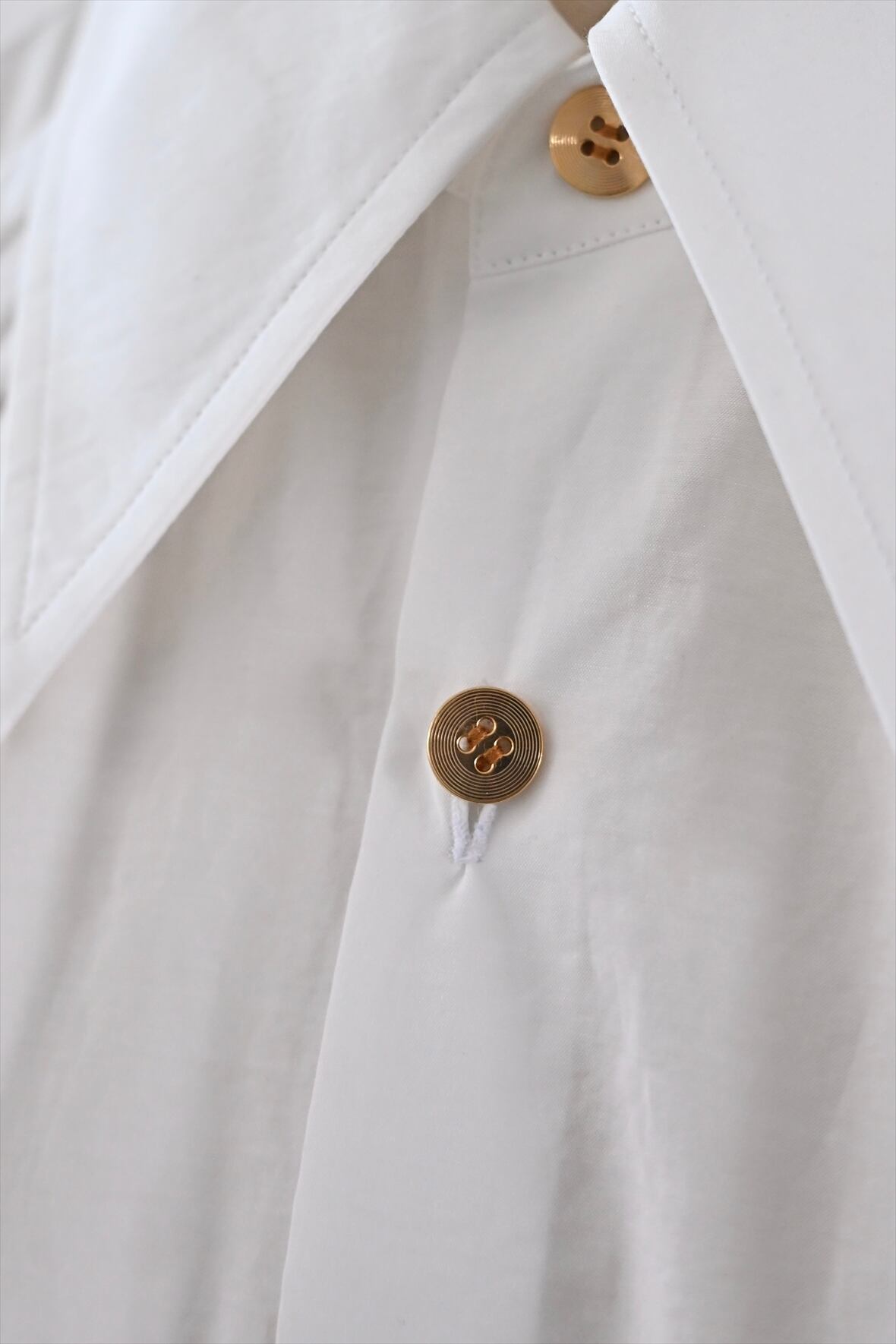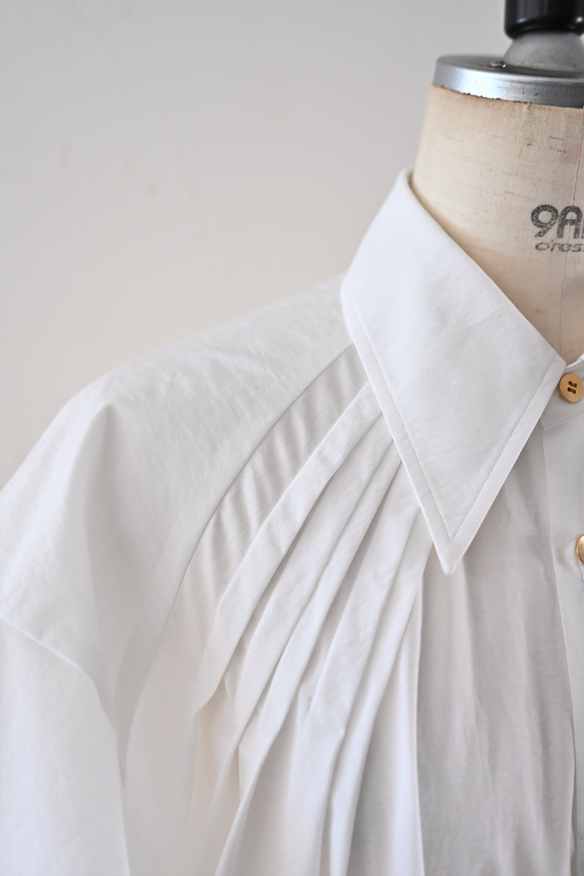 MASAHIRO OKUNOらしさを詰め込んだシャツワンピースならぬシャツドレスです。クラシカルな雰囲気もありながら、さらっと羽織れるドレスに仕立てています。袖のフリルと胸元に施したタックが最大の特徴。胸元のタック、後ネックのタックによって、裾廻りのたっぷりな分量感を作っています。衿は、70年代の雰囲気が漂う通称「デカ衿」。衿の存在感が全体の印象を引き締めています。素材はコットンとナイロンの混紡生地を使用。とても軽く、少し張り感のある風合いです。サイドにはポケット付き。